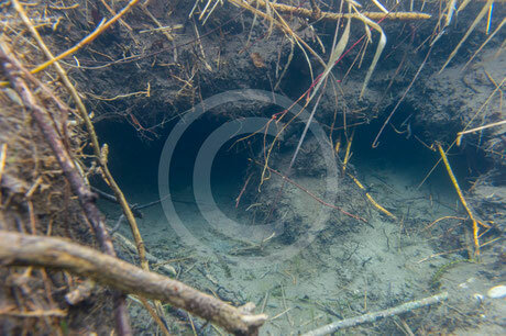 Viele Menschen glauben Biber leben immer in den klassischen “Bilderbuch Biberburgen”. Das ist bei uns aber eher die Ausnahme, es handelt sich hierbei um die seltenste Biberbehausung. Die Biberburg rechts im Bild ist etwa 3m hoch und hat eine Basis von mehr als 10m Durchmesser. Schon viele Bibergenerationen haben an dieser Burg gebaut und diese ausgebessert. Etwa in der Mitte der Burg befindet sich der Biberkessel, eine Kammer in der die Biberfamilie lebt. Der Eingang hierzu ist immer unter Wasser. Die Biber müssen also durch eine Art “Siphon” immer hinein- bzw. heraustauchen. Das verhindert ungebetene Besucher und Feinde.